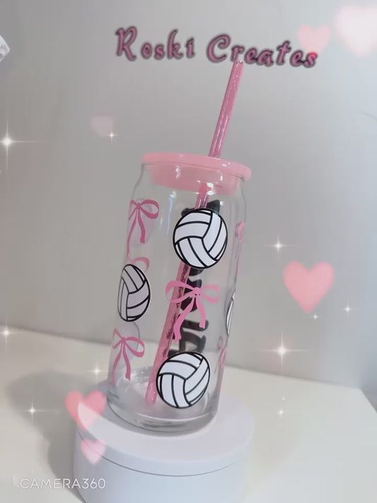 Coquette Volleyball girly glass cup perfect for any drinks hot or cold 16oz resistant glass pink lid sports girls with glitter straw